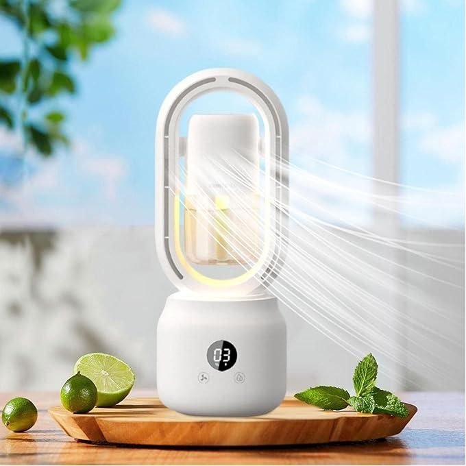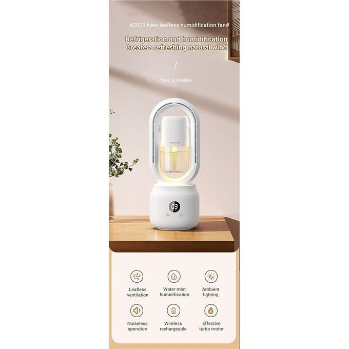 Enhance your living and working environment with this 3-in-1 air humidifier fan, designed to combine comfort, safety, and versatility in one compact device. This multifunctional appliance works as a bladeless fan, a cool mist humidifier, and a soft bedside lamp, making it a perfect addition to homes, offices, and personal spaces.